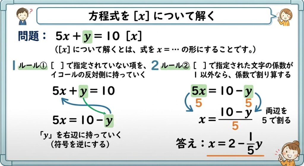 []で指定されていない文字や数字の項はイコールの反対側に持っていく。その際、イコールをまたいだ場合は符号を変えること。