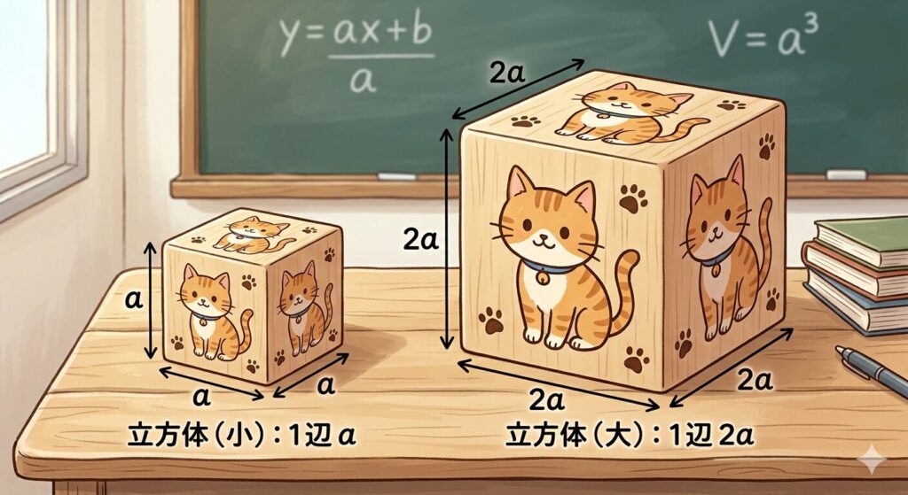 本題は、左の立方体より1辺を2倍したら、体積は何倍になりますか?です。