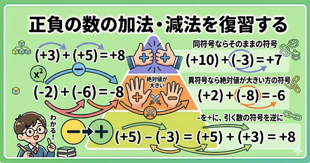 また、先程まで符号が違う足し算ってどうやるの?と考えていました。