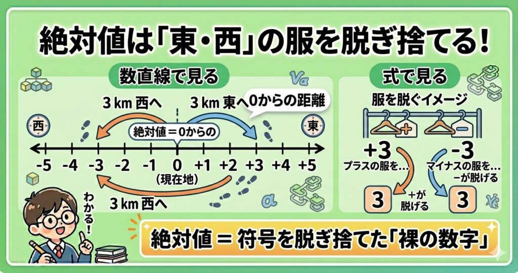 なので「+3」は東に3km、「−3」は西に3kmと表せると同時に、0から歩く距離はどちらも3kmといえますね。