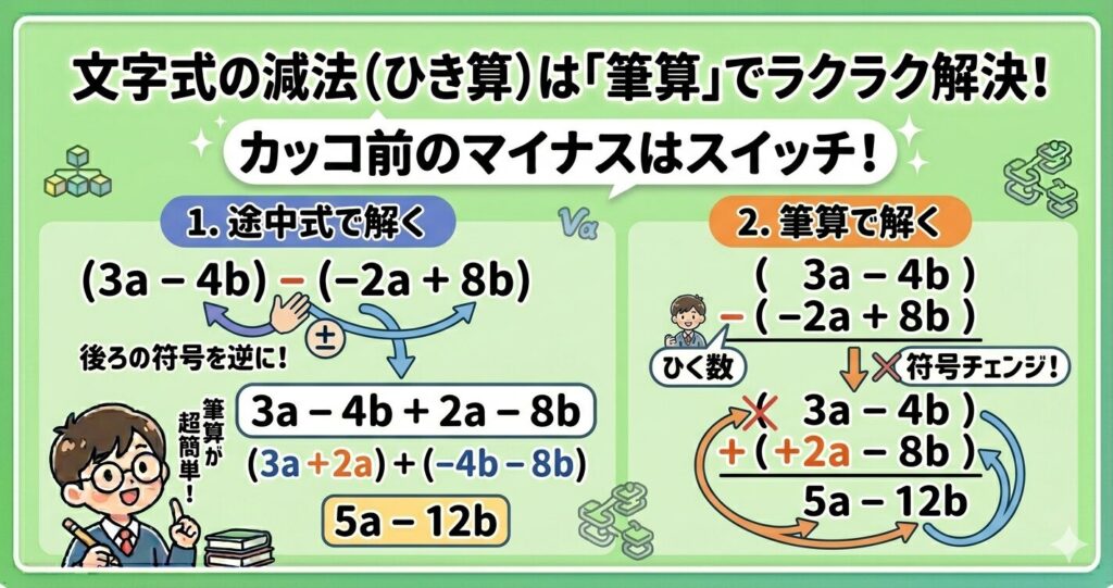 引き算であれば、符号チェンジを忘れないようにしましょう。