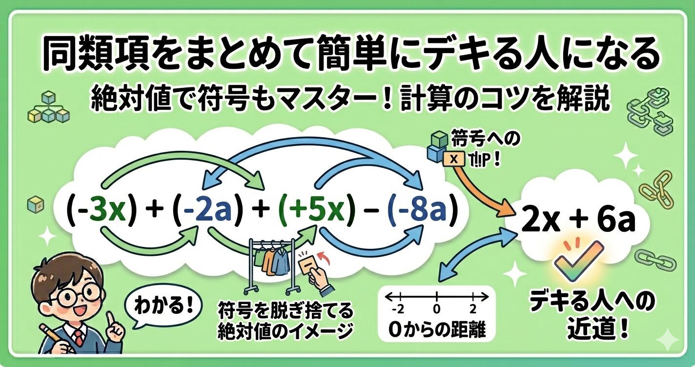 ですので、同類項をまとめるときに「同符号はそのままの符号」とは