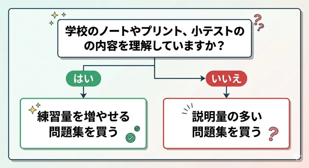 その際は説明が多め、問題数が少なめの問題集を選びます。